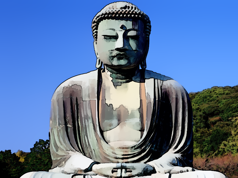 Progressive image abstractions computed using our edge-preserving decompositions. This example reveals a limitation: at the coarsest level, the edge near the shoulder collapses letting the sky color to bleed into the statue.