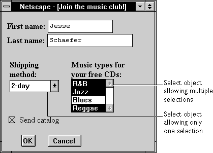 Example 1. The following example displays two selection lists. In the first list, the user can select only one item; in the second list, the user can select multiple items.